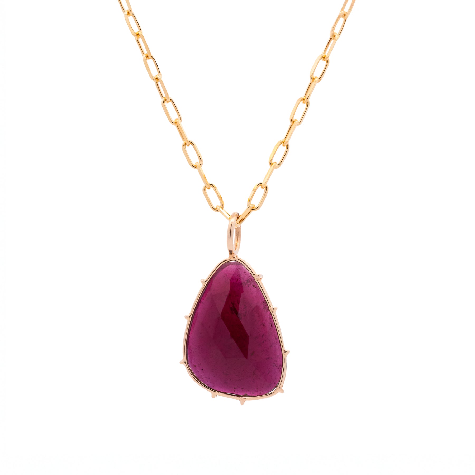 A medium sized, faceted garnet wrapped in yellow gold wire.