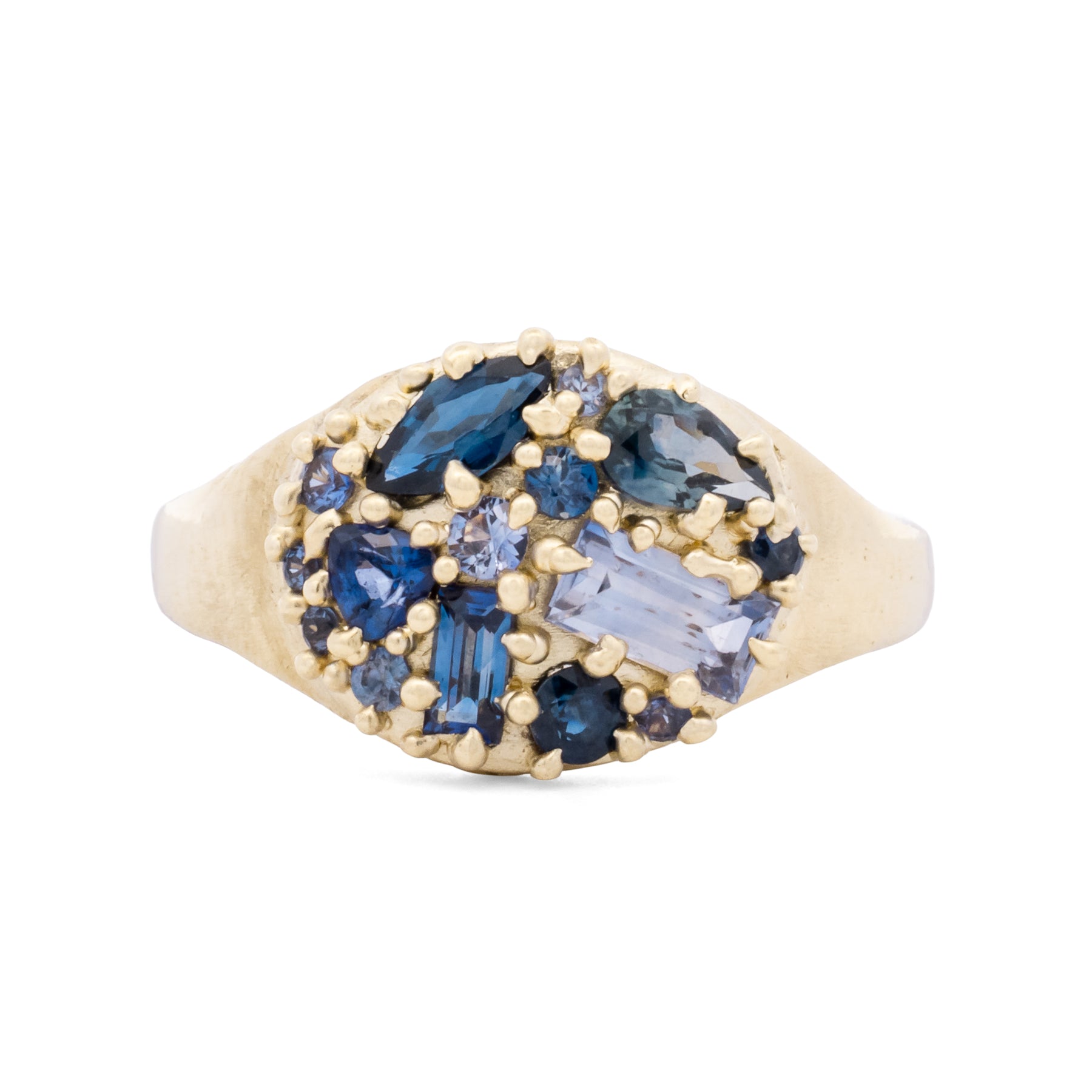 This solid 14K gold signet ring, features an eclectic cluster of blue sapphires in varying hues, shapes, and sizes.