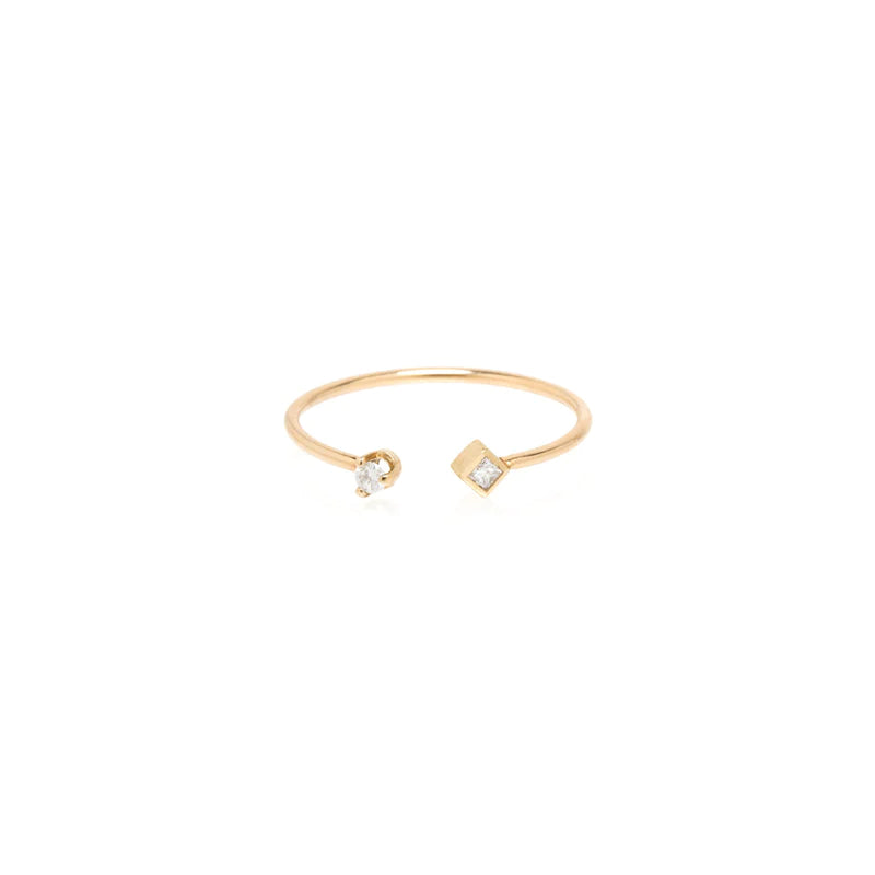 Yellow gold open thin band ring with a prong set white diamond on one side and a bezel set white princess diamond on the other side.