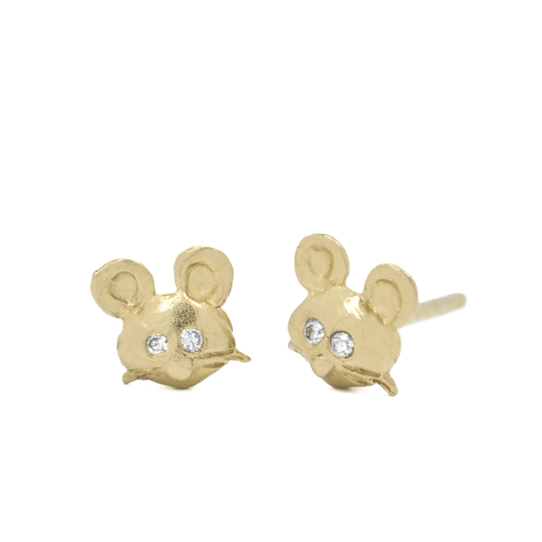 Tiny gold mouse earrings with diamonds.