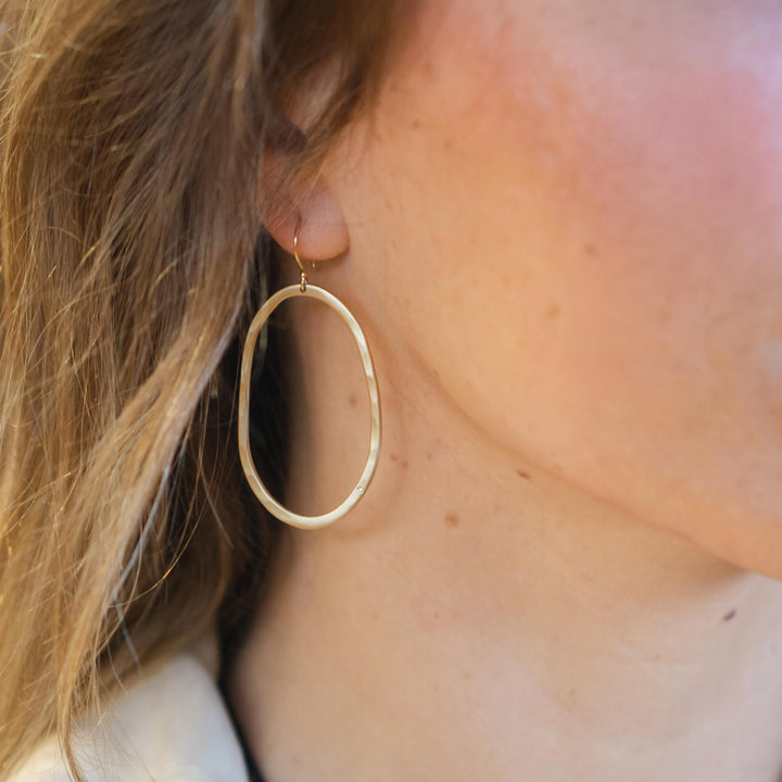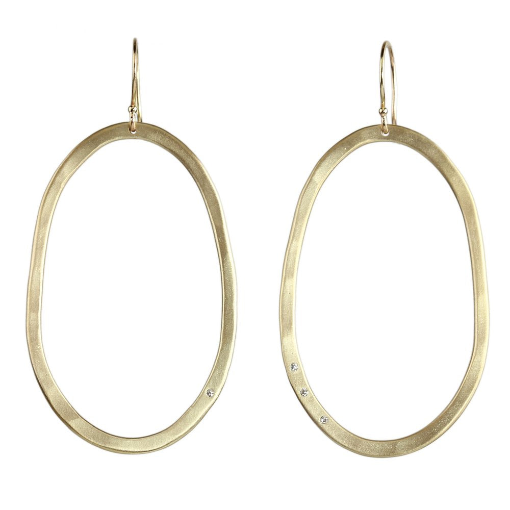 Hammered, organically shaped ovals with flush set white diamonds (3 diamonds in one earring, one diamond in the other).