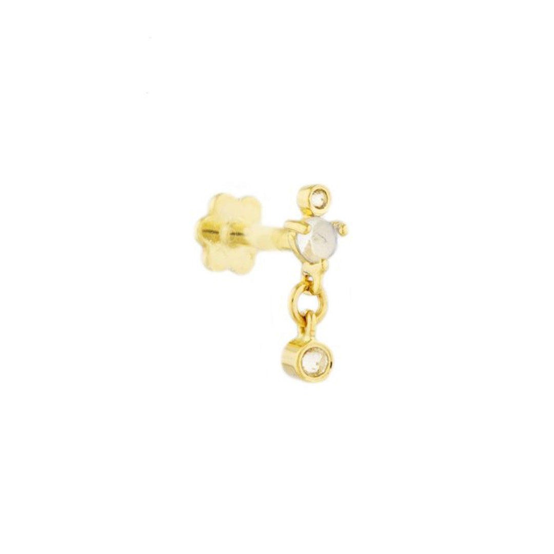 This 14K light yellow gold post earring by Celine Daoust features a moonstone framed by two delicate diamonds.