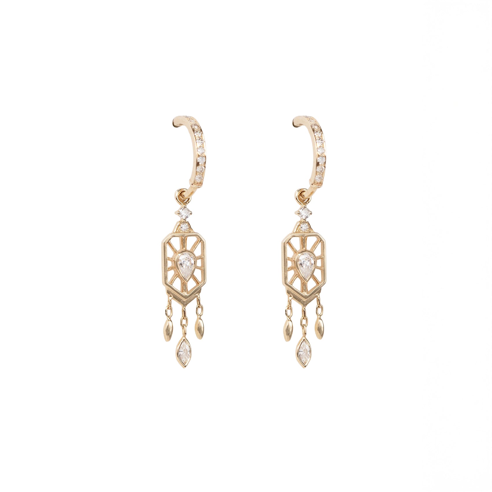 Celine Daoust’s 14k light yellow gold Dream Maker hoop earrings feature pear-shaped diamonds, dangling accents, and a marquise diamond for an elegant, dynamic design.