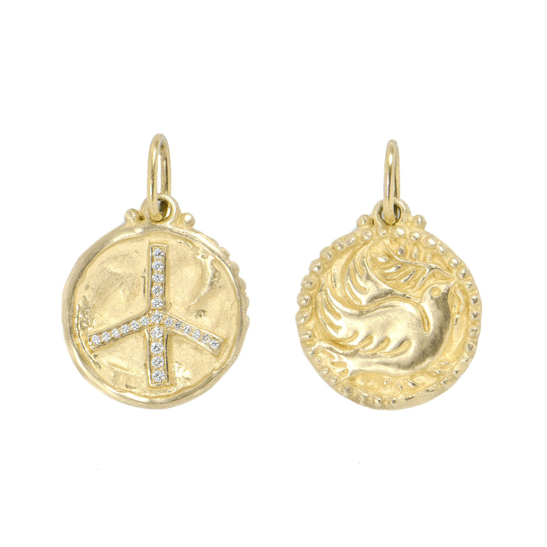 A yellow gold charm with a diamond peace symbol on one side and a dove holding an olive branch on the other side.