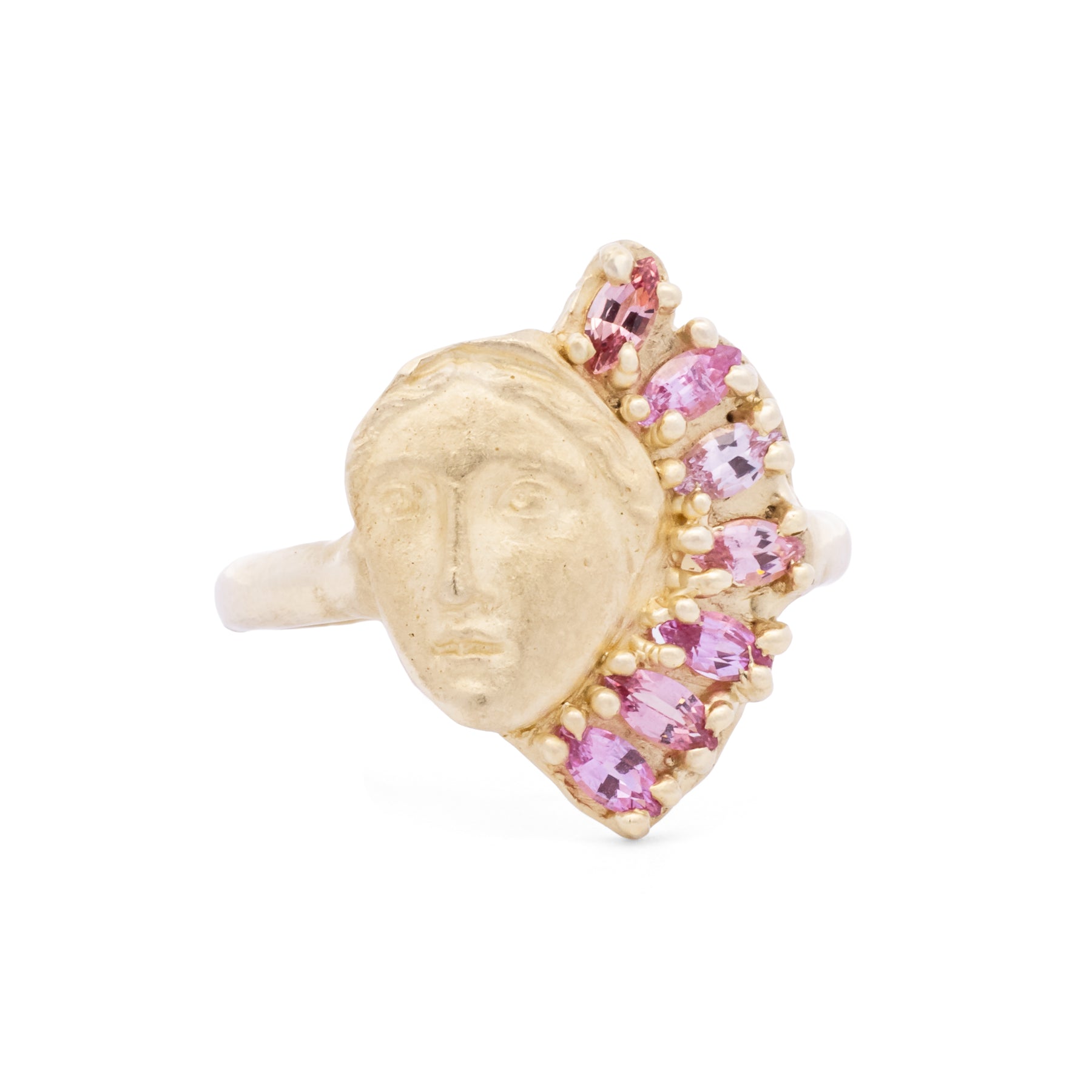 The Sybil ring, inspired by the legendary seers of Greek mythology, embodies mystery and divine intuition. Crafted in luminous 14K yellow gold, this one-of-a-kind design showcases pink sapphires. A timeless tribute to those who once revealed destinies, this ring is a captivating fusion of history and vibrant elegance.