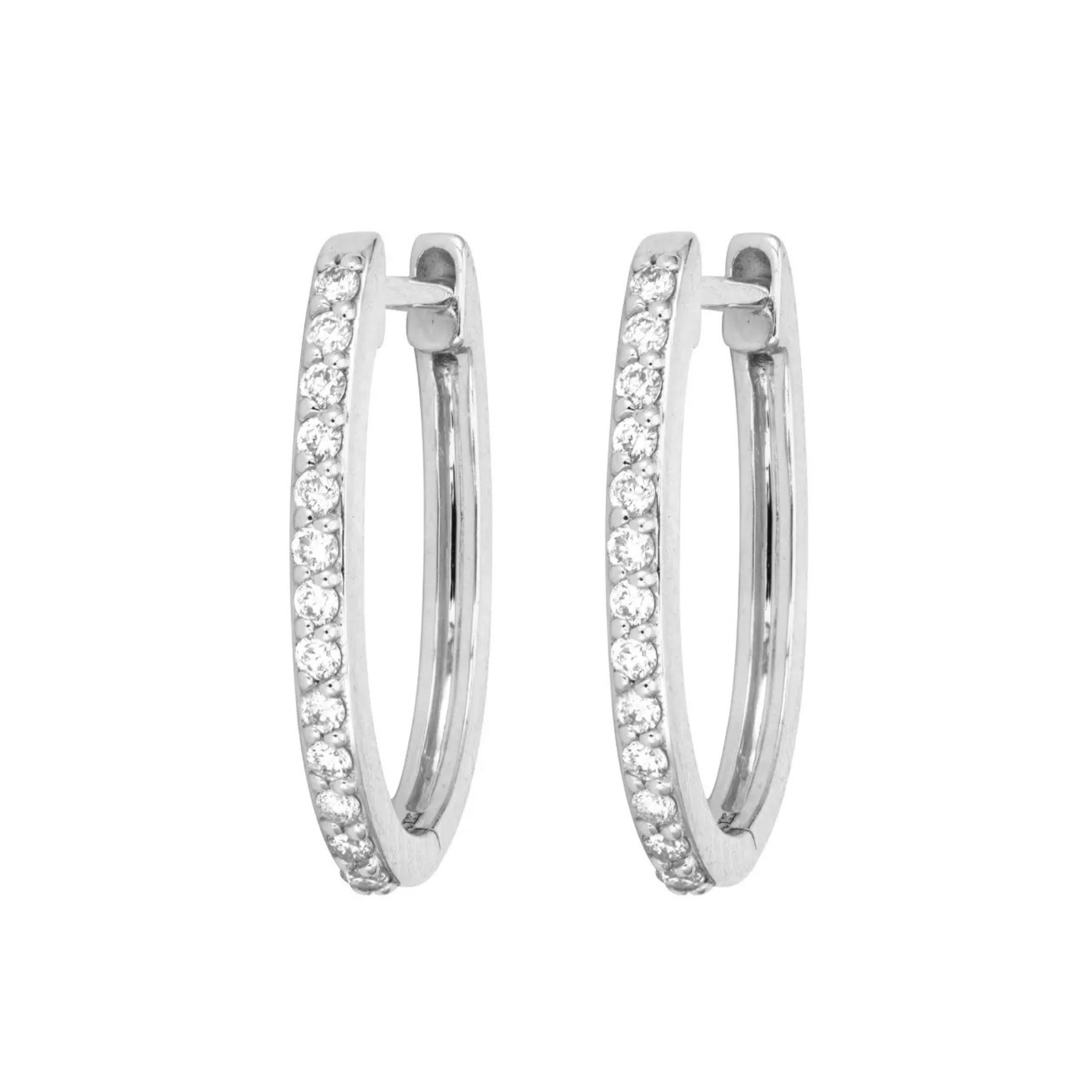 These "Classic Small Oval Pave Hoop" earrings are made from white gold with pave sparkling round diamonds. These stunning oval hoops make a statement on their own or with any Three Stories charm dangling from them.