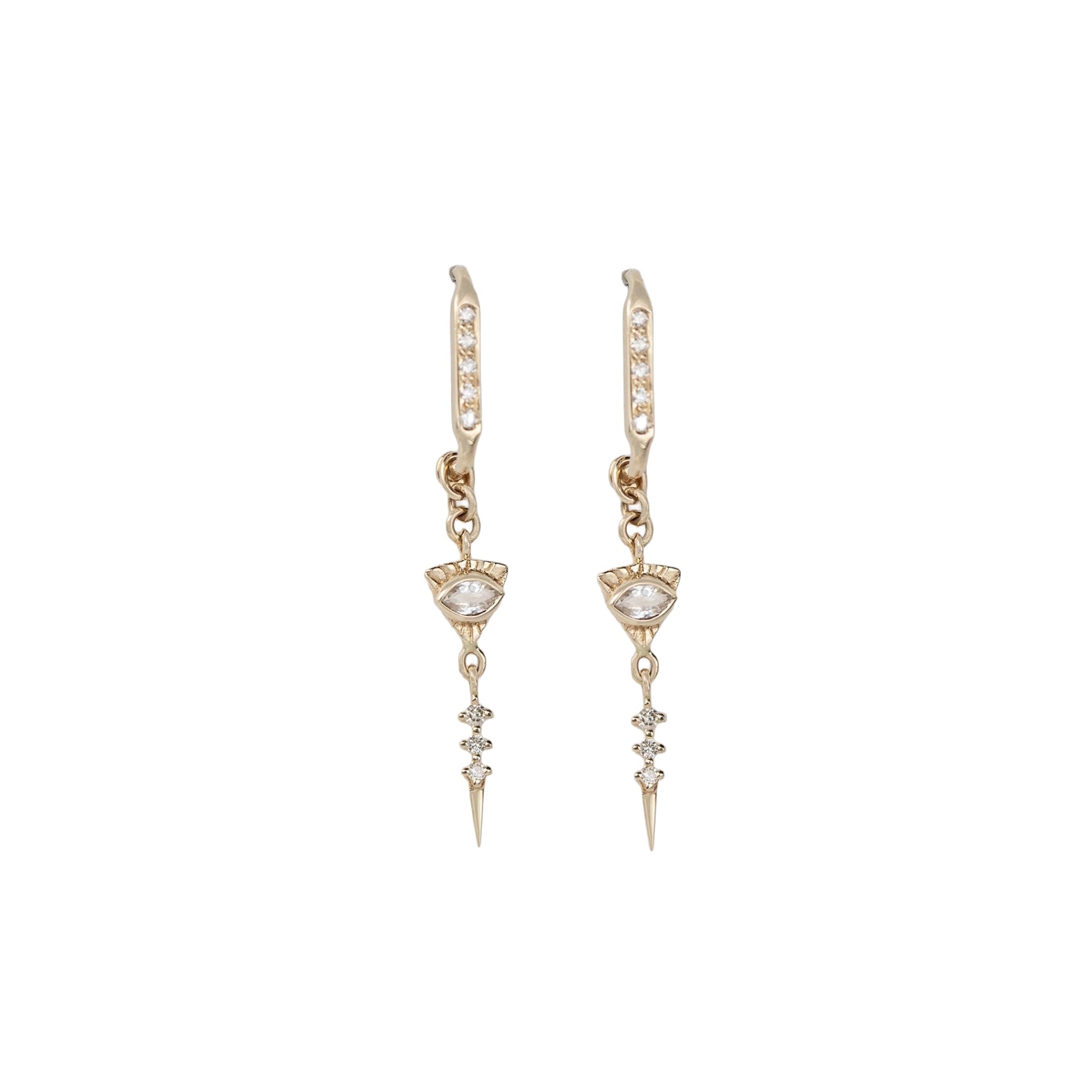 Celine Daoust’s 14k light yellow gold totem eyes drop earrings feature marquise white sapphires and delicate diamond accents.
