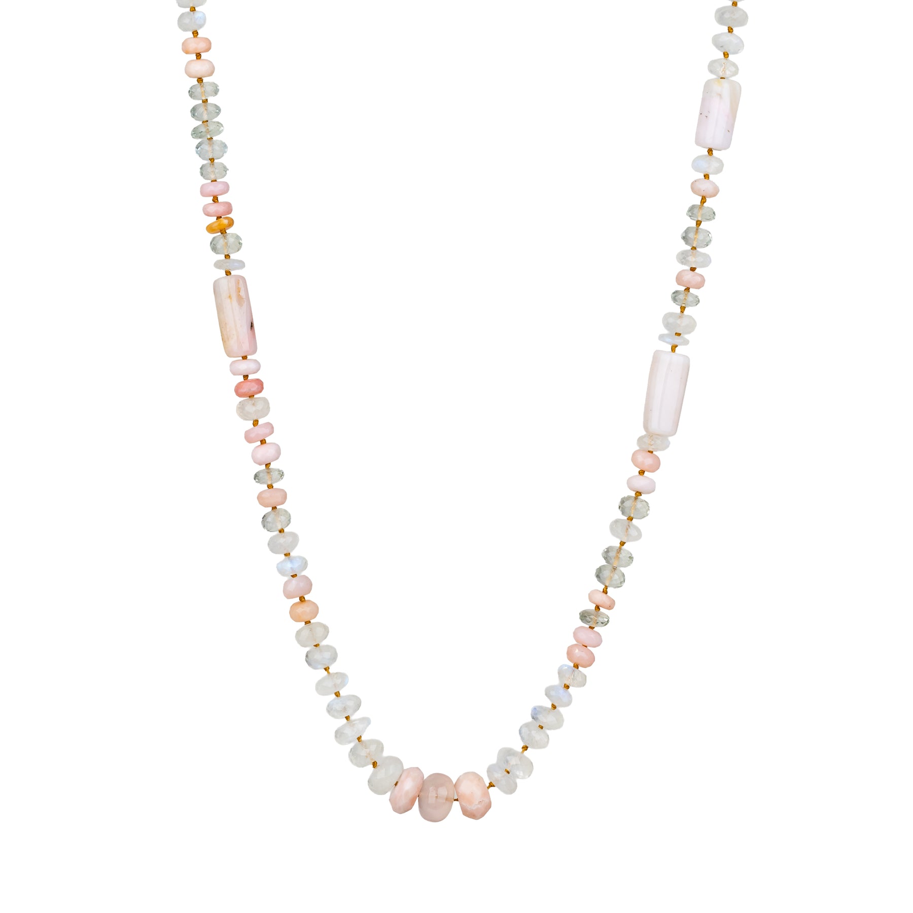 Graduated necklace with alternating sections of cylindrical pink opal beads and rondelle moonstone, rose quartz, aquamarine and green amethyst faceted beads. Strung on hand-knotted silk cord with a gold s-clasp.