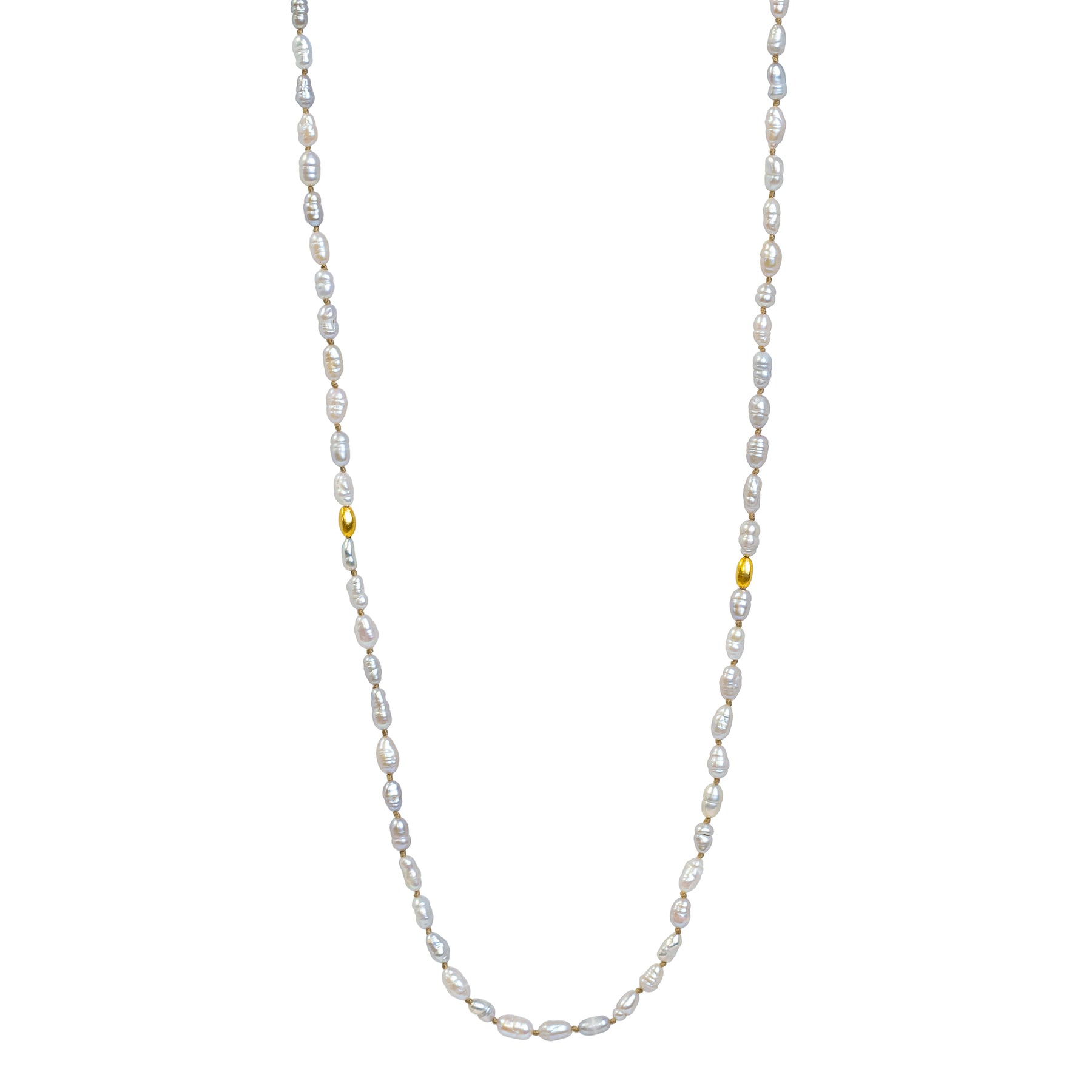Vintage Japanese Pearl necklace with 18K yellow gold nuggets, strung on a silk cord with a gold s-clasp. This necklace can be worn long, or doubled up to make a short necklace.