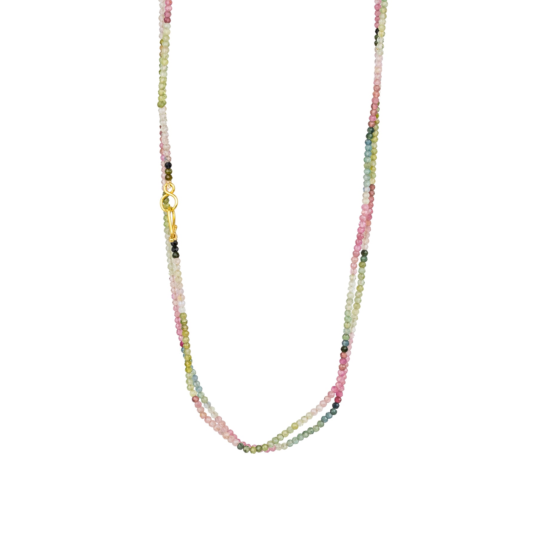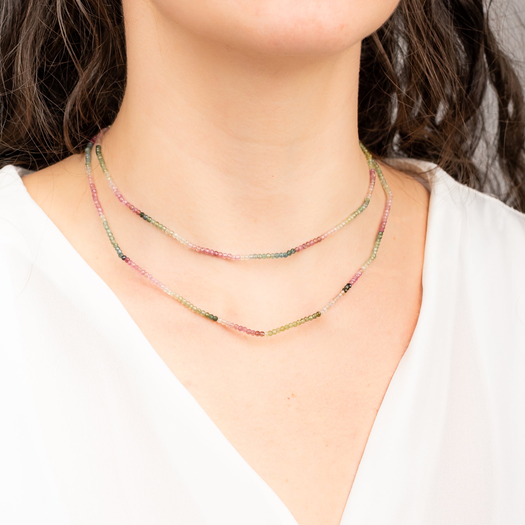 Faceted watermelon tourmaline beaded necklace strung on silk cord with a gold s-clasp. This necklace can be worn long, or doubled up to make a short necklace.