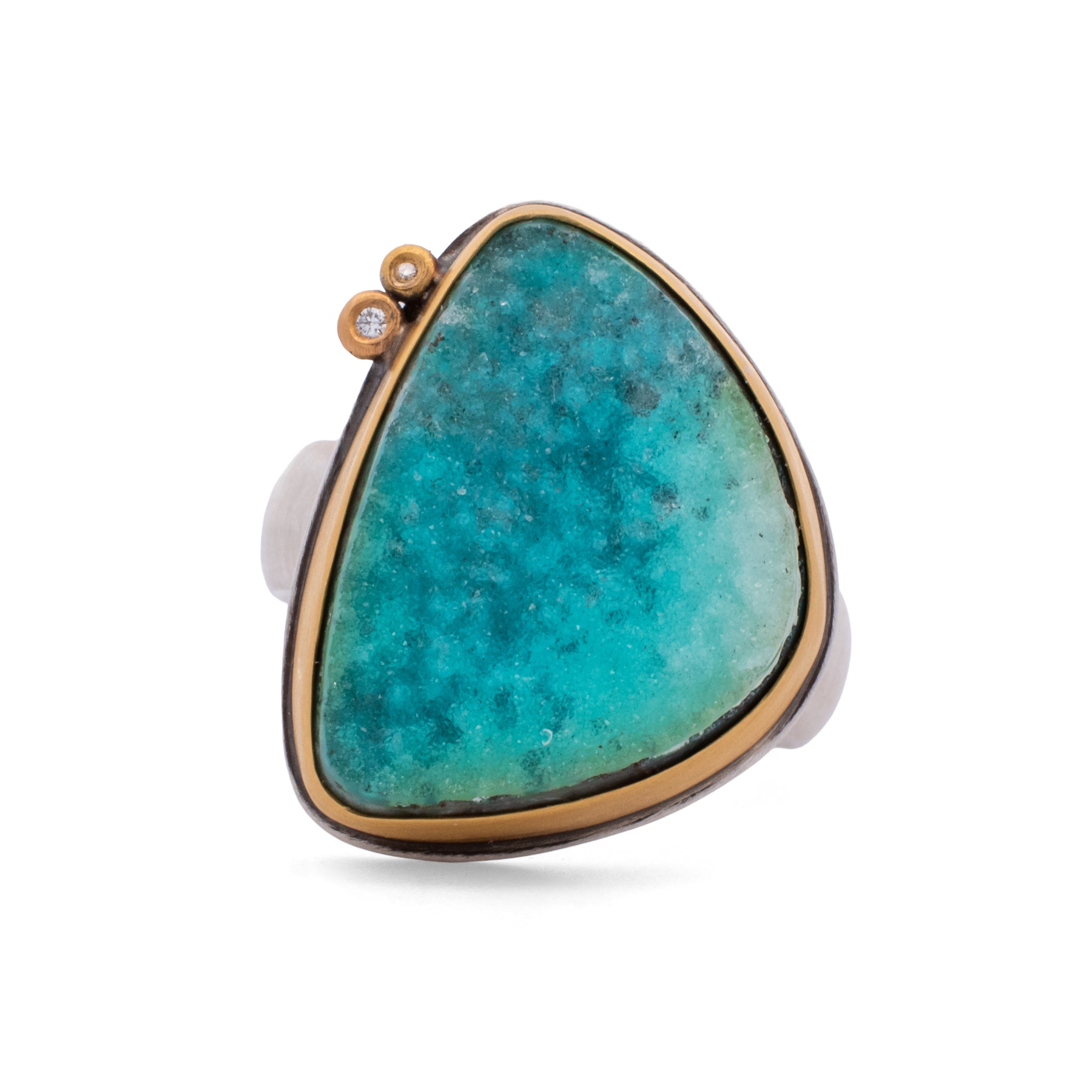 - Set in a 22K yellow gold bezel with sterling silver platform & band