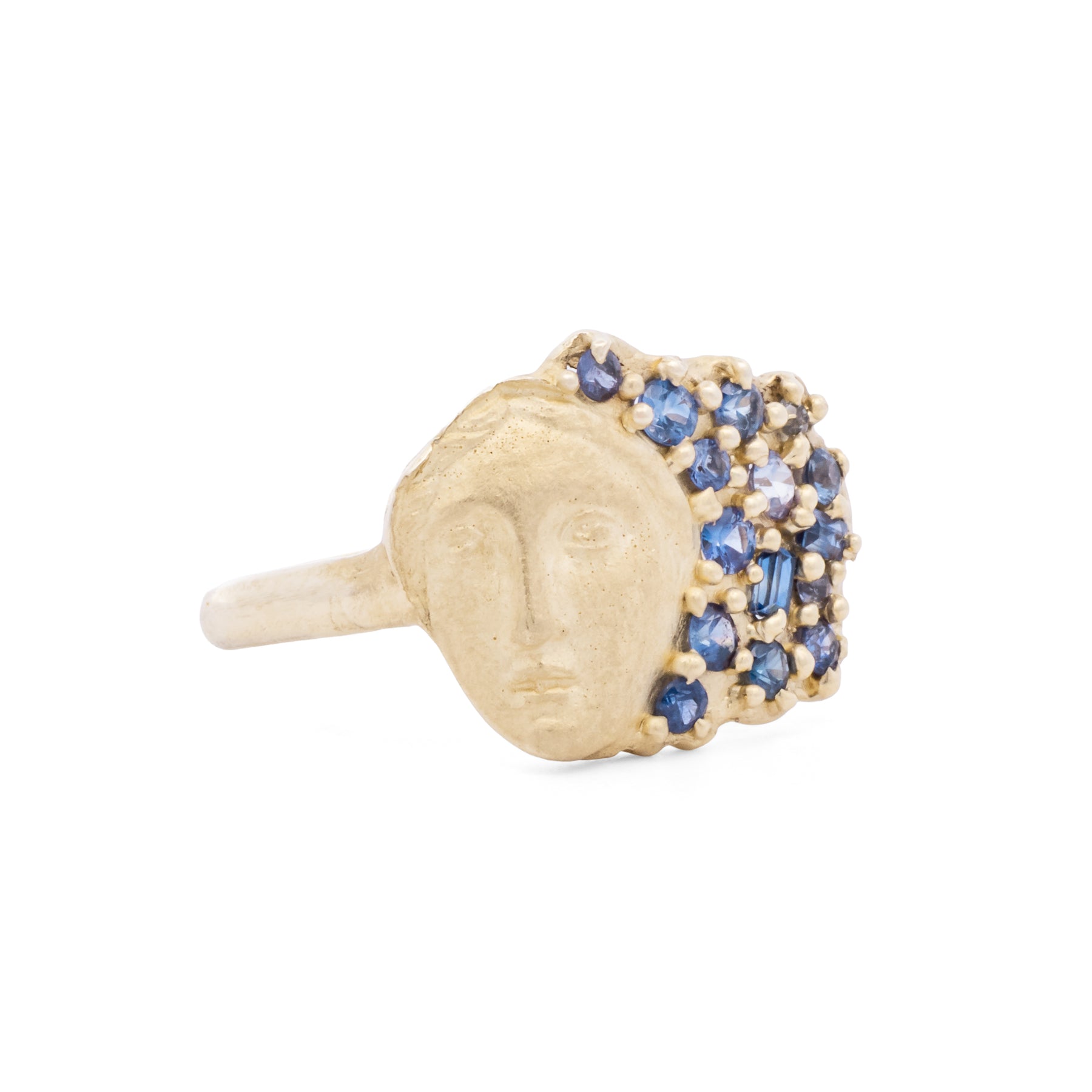 The Sybil ring, inspired by the legendary seers of Greek mythology, embodies mystery and divine intuition. Crafted in luminous 14K yellow gold, this one-of-a-kind design showcases vibrant blue sapphires. A timeless tribute to those who once revealed destinies, this ring is a captivating fusion of history and vibrant elegance.