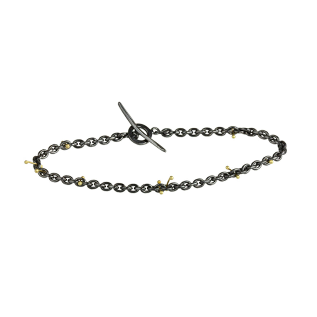 Heavy oxidized silver chain bracelet with delicate handcrafted yellow gold pins.