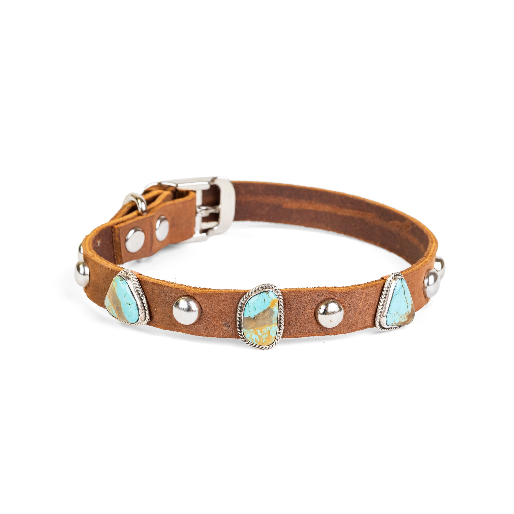Hand crafted Navajo dog collar with bezel set asymmetrical Kingman turquoise.