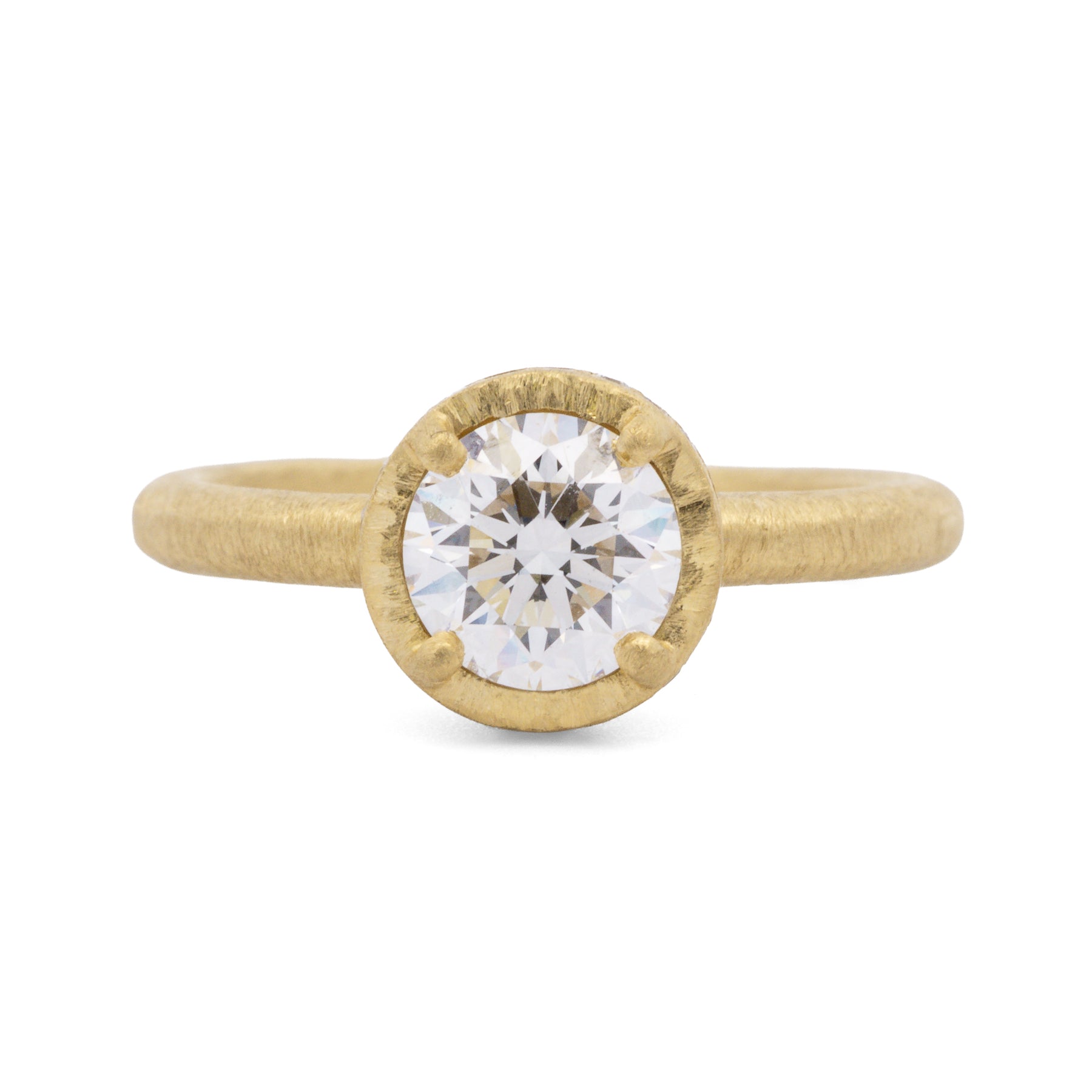 Warm yellow gold setting with an old euro cut diamond and a hammered band.