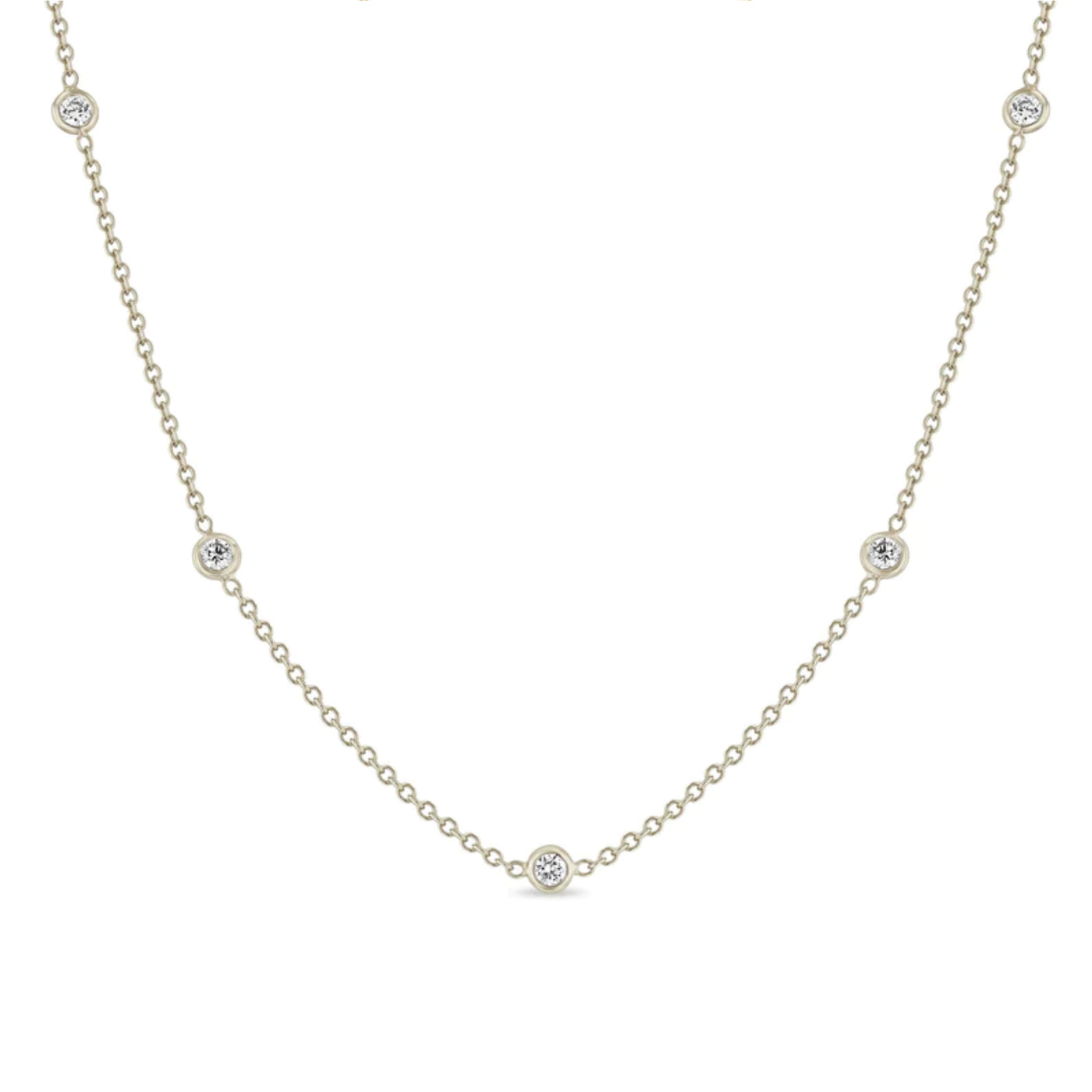 White gold cable chain necklace with five stations of floating round white diamonds set in the chain.