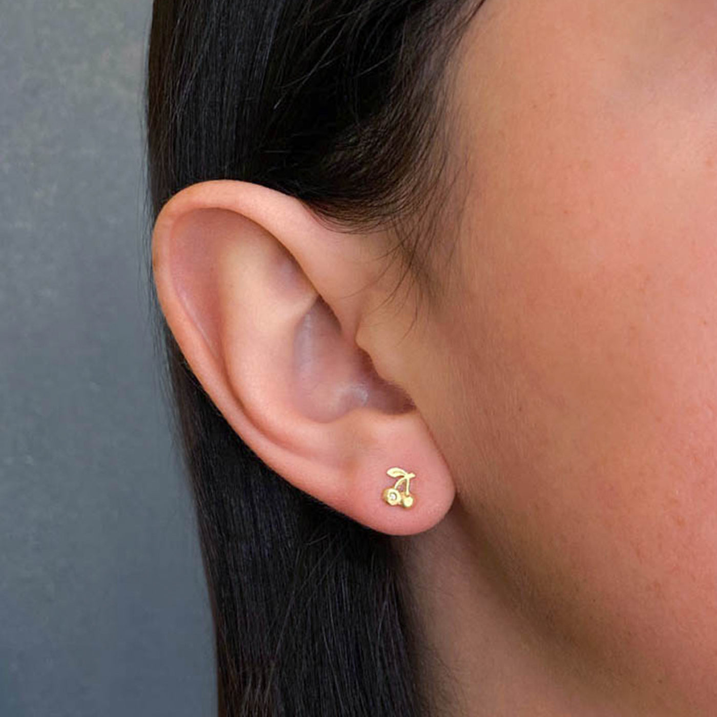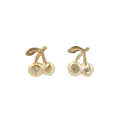Yellow gold cherry stud earrings with sprakling diamonds.