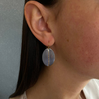 Flat oxidized silver ovals with yellow gold hammered stems and earwires.