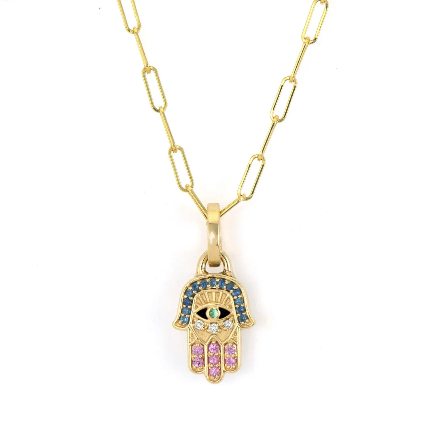 This double sided hamsa is made with 14k yellow gold with diamonds on one side and blue and pink sapphires, emeralds and diamonds on the other side.