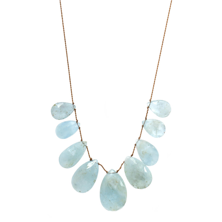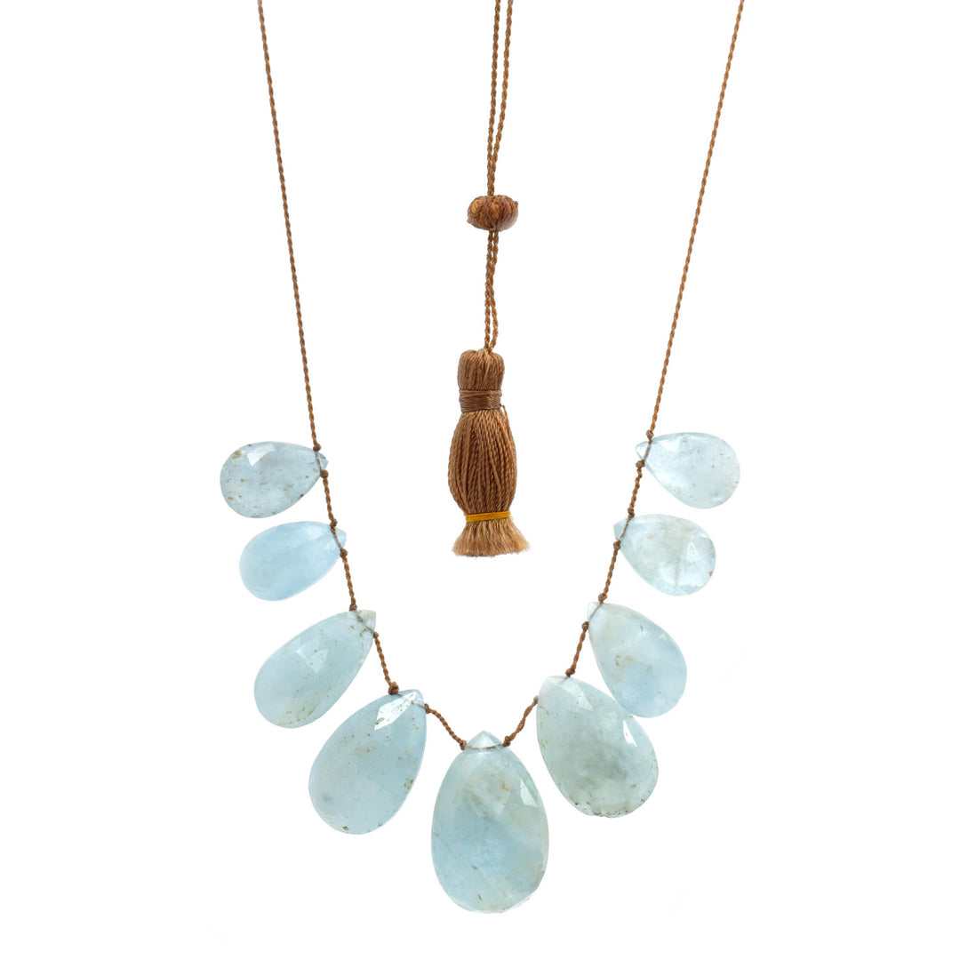 This Lena Skadegard necklace features large faceted teardrop aquamarine gemstones, strung on a tan cord for an effortless, organic look. Finished with an adjustable sliding tassel toggle clasp.