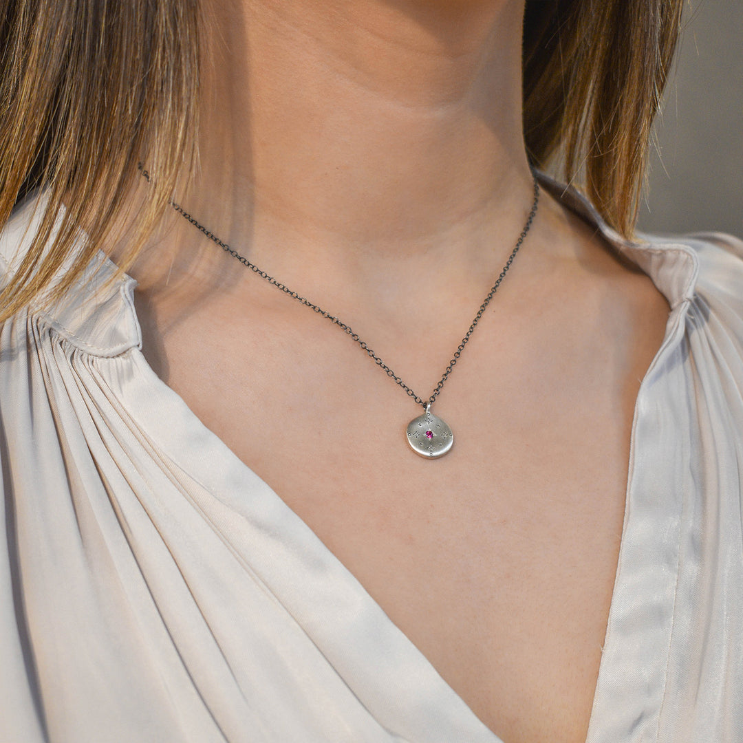 An organically shaped satin finished sterling silver pendant with a hand set ruby and star etching.