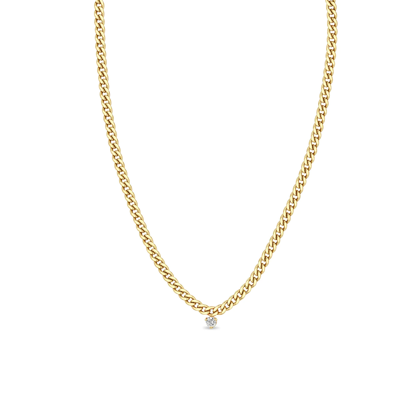 Yellow gold small hollow curb chain necklace with a prong set white diamond pendant set underneath the chain.