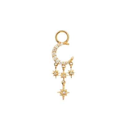The "Make a Wish Small Crescent Moon and Star Charm" features yellow gold with sparkling round diamonds. This shimmering charm looks amazing on a Three Stories hoop earring or added to a detachable bail and hung on a Three Stories chain necklace or bracelet.
