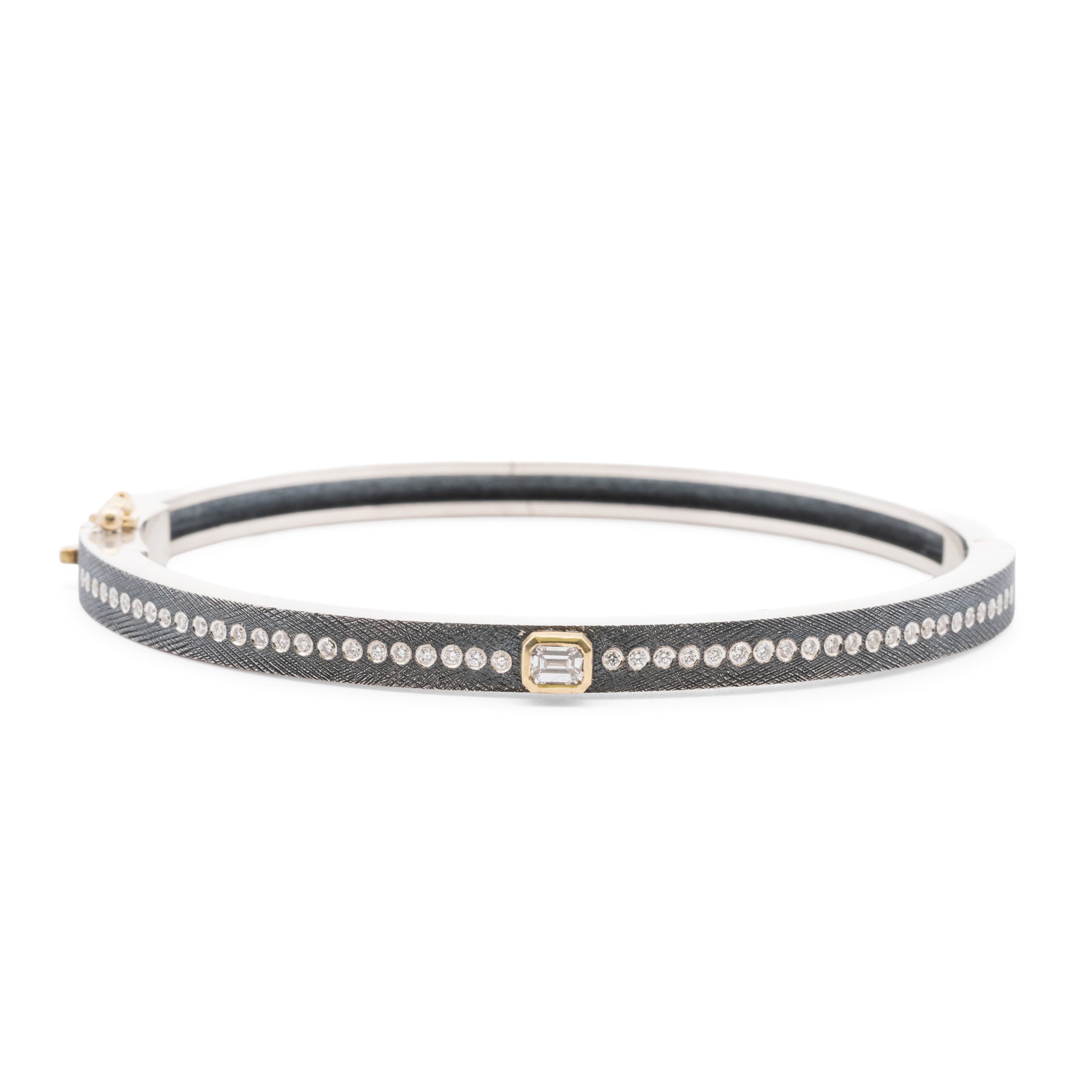 Sterling silver bangle with a yellow gold bezel set emerald cut diamond and a row of sparkling white diamonds.