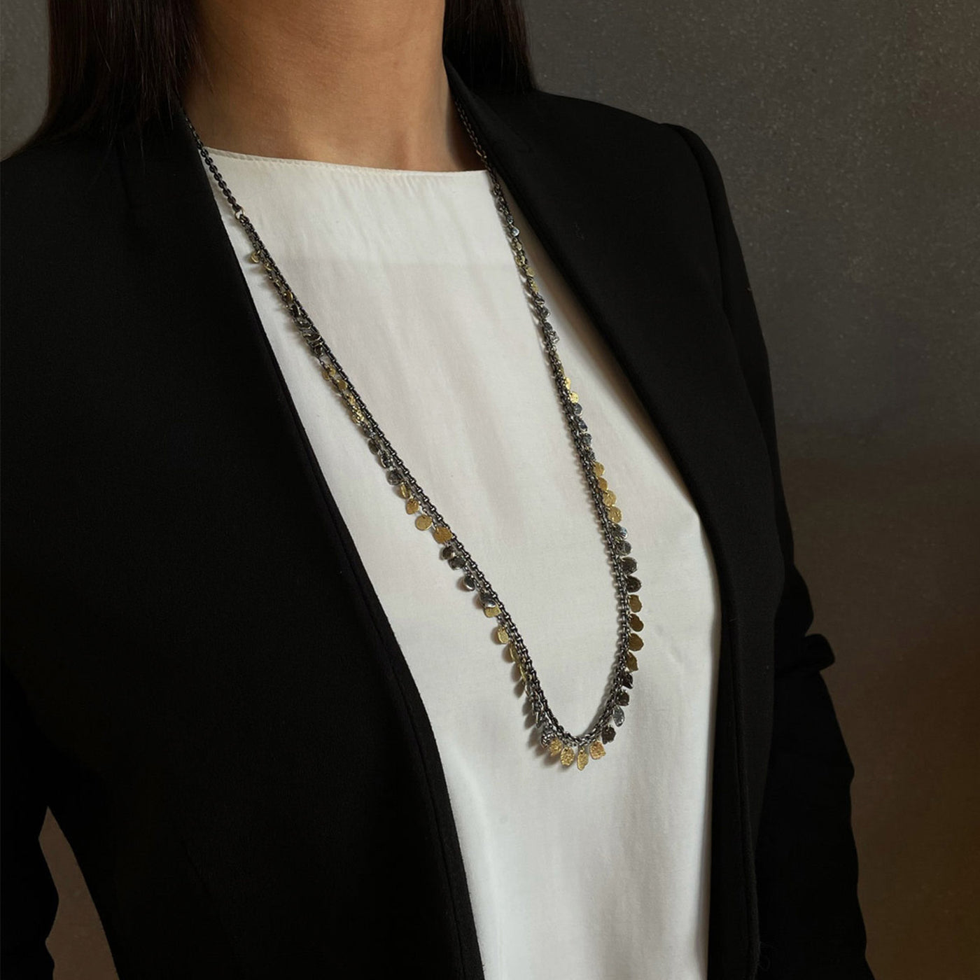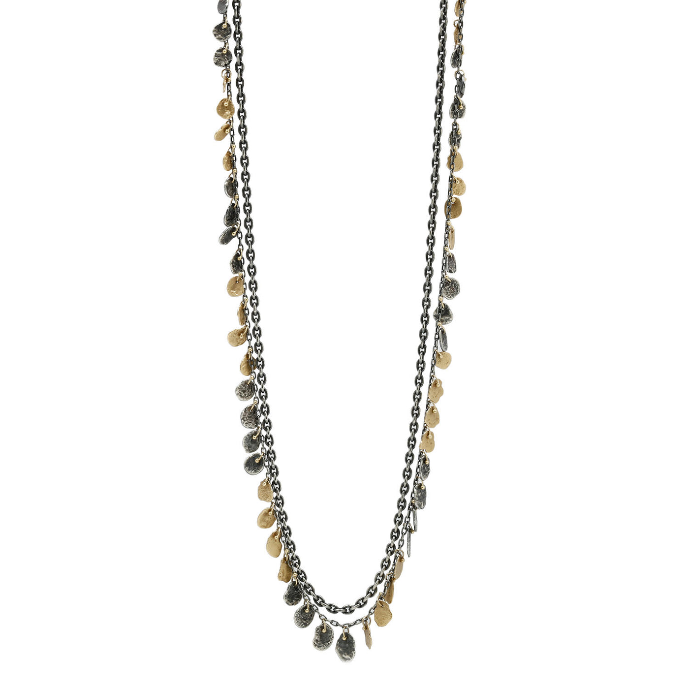 A cascade of oxidized silver and gold handmade charms are attached with gold bead rings to heavy oxidized sterling silver chain featuring a double solid plain chain.